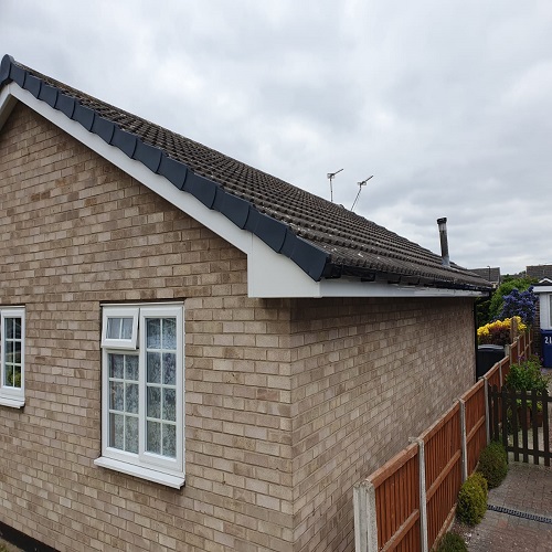 As you can see, we have installed rosewood style fascias and soffits and end caps to this family home, and which closely match the windows and doors, the roofing tiles, the fencing and even next doors styling also. Most people think of PVCue materials as being white and white only, but at Northern Roofline we can supply a number of different colours to match the existing scheme of your exterior design.